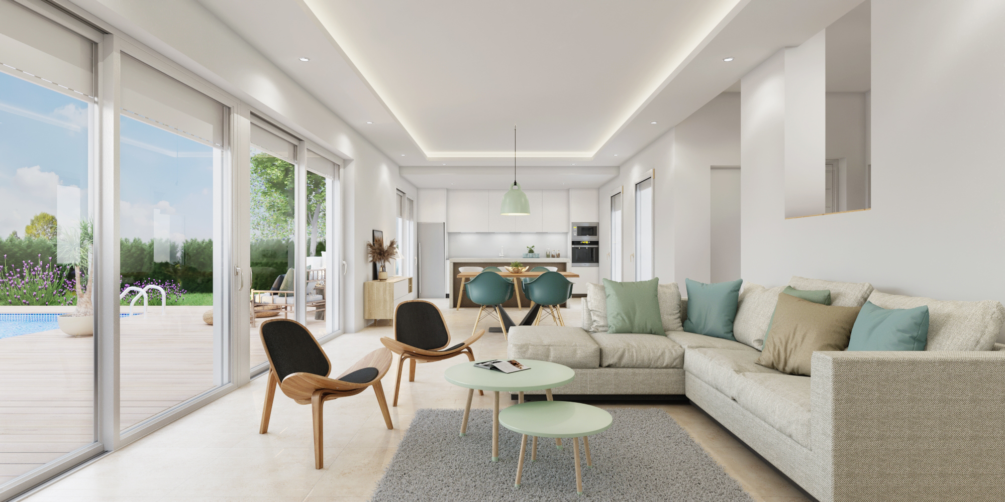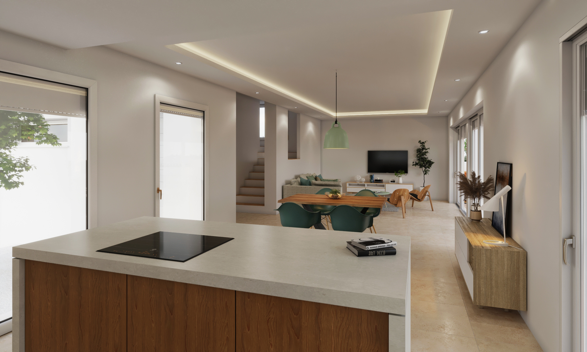 Disfruta de una amplia sala de estar, comedor y cocina con isla en la planta baja, junto con un dormitorio y baño independiente.